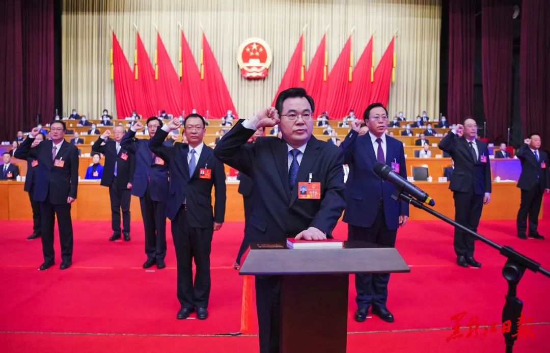 会议举行宪法宣誓仪式。新当选的15名同志向宪法宣誓。胡昌升领誓。